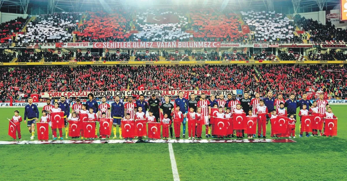 Ev sahibi ekibin taraftarları iki büyük Türk bayrağını tribünlerde dalgalandırırken,
