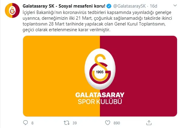 Galatasaray Spor Kulübü resmi Twitter hesabından yaptığı açıklamada, genel kurul toplantısının geçici olarak ertelendiğini duyurdu. Kararın İçişleri Bakanlığı'nın yayınladığı koronavirüs tedbirleri kapsamında alındığı ifade edildi.