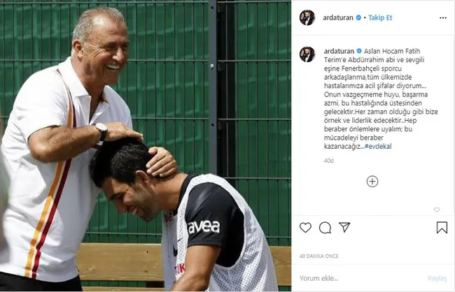 Arda Turan, sosyal medya hesabından Fatih Terim ile çekilmiş bir fotoğrafını paylaşarak altına şu notu düştü: "Aslan hocam Fatih Terim'e, Abdurrahim ağabey ve sevgili eşine, Fenerbahçeli sporcu arkadaşlarıma, tüm ülkemizde hastalarımıza acil şifalar diyorum. Onun vazgeçmeme huyu, başarma azmi, bu hastalığın da üstesinden gelecektir. Her zaman olduğu gibi bize örnek ve liderlik edecektir. Hep beraber önlemlere uyalım. Bu mücadeleyi beraber kazanacağız."