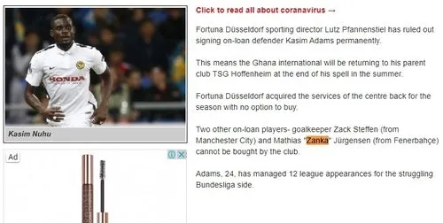 Sezon başında büyük umutlarla transfer edilen Danimarkalı Milli yıldız, gösterdiği performansla taraftarların eleştirilerinin odak noktası haline gelmişti. Yaptığı kritik hatalarla saç baş yoldurtan Zanka, ara transfer döneminde Fortuna Düsseldorf'a kiralanmıştı.