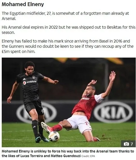 "27 yaşındaki Mısırlı orta saha oyuncusu, Arsenal'de unutulmuş bir adam. Arsenal ile anlaşması 2022'de sona eriyor ancak bu yaz Beşiktaş'a gönderildi. Elneny, 2016'da Basel'den geldikten sonra takımda iz bırakamadı. Arsenal, kendisi için harcanan 5 milyon sterlini telafi edip edemeyeceğini görmek istiyor. Elneny, Torreira ve Guandouzi'nin başarılı oyunu nedeniyle Arsenal'e geri dönmeye zorlanıyor."