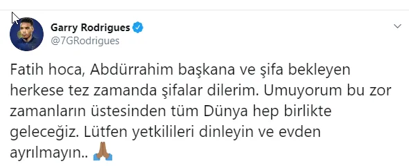 Sarı-lacivertli futbolcu, sosyal medya hesabından paylaştığı mesajında, "Fatih hoca, Abdürrahim başkana ve şifa bekleyen herkese tez zamanda şifalar dilerim. Umuyorum bu zor zamanların üstesinden tüm dünya hep birlikte geleceğiz. Lütfen yetkilileri dinleyin ve evden ayrılmayın" ifadelerini kullandı.