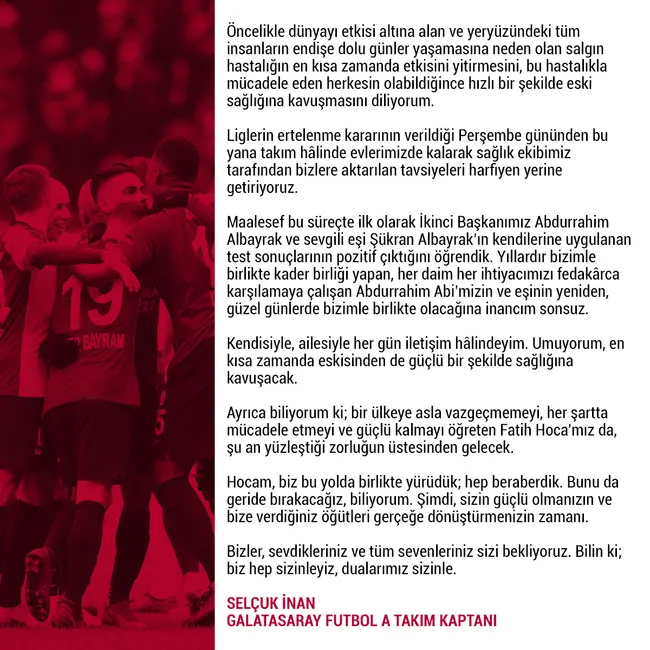 Galatasaray takım kaptanı Selçuk İnan, corona virüsü (COVID-19) testleri pozitif çıkan teknik direktör Fatih Terim ve ikinci başkan Abdurrahim Albayrak hakkında açıklamalarda bulundu. Kulübün resmi sosyal medya hesabından yapılan paylaşımda Selçuk İnan, Terim ve Albayrak için duygu dolu ifadeler kullandı.