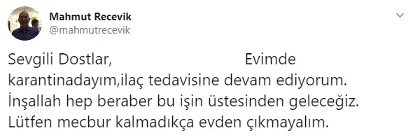 ''Sevgili dostlar, evimde karantinadayım. İlaç tedavisine devam ediyorum. İnşallah hep beraber bu işin üstesinden geleceğiz. Lütfen mecbur kalmadıkça evden çıkmayalım.''