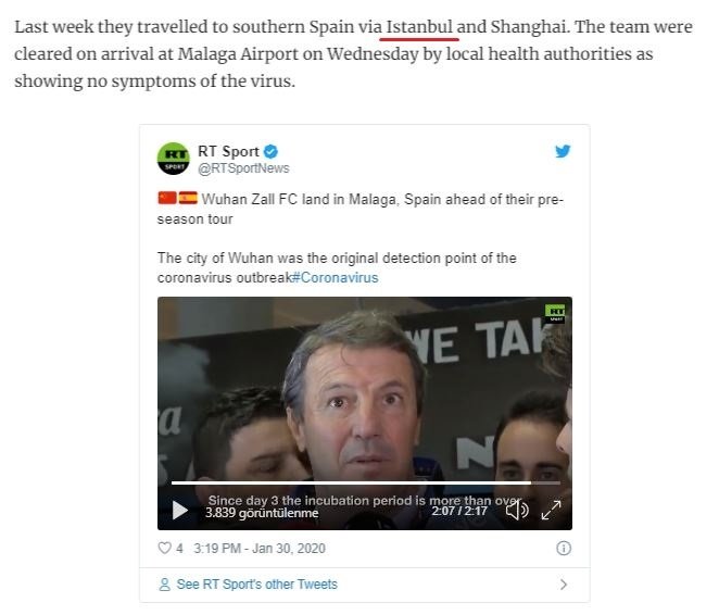 Takımın yolculuğu ile ilgili ise şok bir gerçek ortaya çıktı. South China Morning Post'ta yer alan habere göre ocak ayında Çin'den İspanya'ya giden takım, İstanbul'da mola verdi.