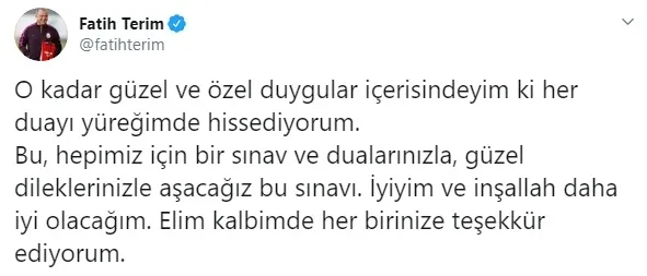 Corona virüsü (COVID-19) testi sonucu pozitif çıkan Galatasaray Teknik Direktörü Fatih Terim sosyal medya hesabından paylaşımda bulundu. Güzel ve özel duygular içerisinde olduğunu belirten Terim her duayı yüreğinde hissettiğini belirterek güzel dileklerle bu sınavı aşacağını söyledi.