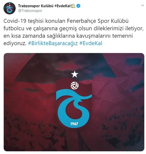 "Covid-19 teşhisi konulan Fenerbahçe Spor Kulübü futbolcu ve çalışanına geçmiş olsun dileklerimizi iletiyor, en kısa zamanda sağlıklarına kavuşmalarını temenni ediyoruz."