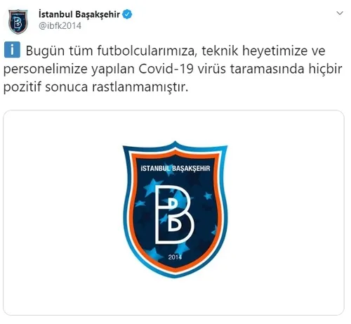 "Bugün tüm futbolcularımıza, teknik heyetimize ve personelimize yapılan Covid-19 virüs taramasında hiçbir pozitif sonuca rastlanmamıştır."