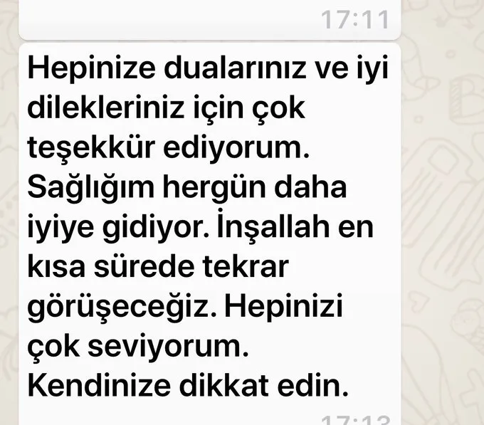 "Hepinize dualarınız ve iyi dilekleriniz için çok teşekkür ediyorum. Sağlığın her gün daha iyiye gidiyor. İnşallah en kısa sürede tekrar görüşeceğiz. Hepinizi çok seviyorum. Kendinize dikkat edin."