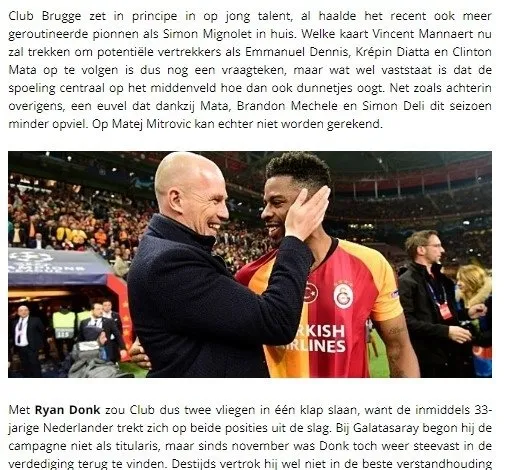 Belçika basını, Galatasaray'da gösterdiği performansla sarı-kırmızılı ekibin başarısında büyük pay sahibi olan Ryan Donk'un Club Brugge için çok faydalı bir transfer olacağını yazdı. Sezon sonu Belçika takımının Galatasaray'ın kapasını çalabileceği ifade edildi.