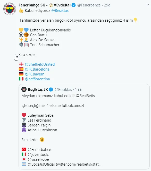 Sporcular ve kulüpler de sosyal medyadan takipçilerine daha fazla ulaşmaya başladı. Yardım kampanyaları, bağışlar, karşılıklı meydan okumalar yapılıyor. Son olarak Beşiktaş'tan Fenerbahçe'ye bir meydan okuma geldi. Kulüpler arasında başlayan 'Efsane oyuncuları seçme' akımına iki ezeli rakip de katıldı.