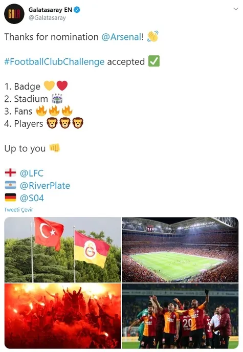 Sarı kırmızılı kulübe bir diğer meydan okuma da İngiliz ekibi Arsenal'den geldi. Galatasaray, İngiliz kulübünün daveti üzerine logo, stadyum, taraftar ve oyuncularının fotoğraflarını paylaşarak Liverpool, River Plate ve Schalke 04'e meydan okudu.