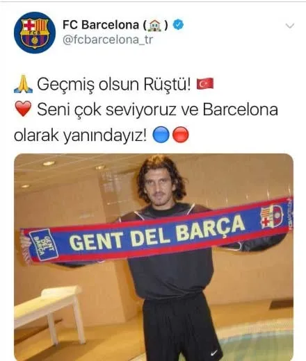 İspanyol kulübünün Türkçe yayın yapan Twitter adresinden yayımlanan mesajda, "Geçmiş olsun Rüştü. Seni çok seviyoruz ve Barcelona olarak yanındayız." ifadeleri kullanıldı.