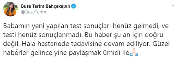 Galatasaray Divan Kurulu Üyesi Tunç Üner'in "Abdurrahim Albayrak ve Fatih Terim'in son test sonuçları negatif çıktı. Çok yakında taburcu olacaklar. Nerede kalmıştık?" şeklindeki tweeti önce Terim'in kızları Merve ve Buse Terim, ardından Abdurrahim Albayrak tarafından yalanlandı.