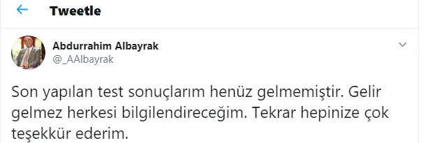 Abdurrahim Albayrak, Twitter hesabından şu açıklamayı yaptı: "Son yapılan test sonuçlarım henüz gelmemiştir. Gelir gelmez herkesi bilgilendireceğim. Tekrar hepinize çok teşekkür ederim."