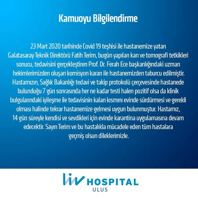 Terim'in tedavi gördüğü Liv Hospital'dan yapılan açıklamada, "Covid 19 teşhisi ile hastanemize yatan Galatasaray Teknik Direktörü Fatih Terim, bugün yapılan kan ve tomografi tetkikleri sonucu, tedavisini gerçekleştiren Prof. Dr. Ferah Ece başkanlığındaki uzman hekimlerimizden oluşan komisyon kararı ile hastanemizden taburcu edilmiştir" ifadeleri kullanıldı.