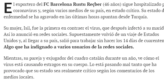 Tüm dünyayı etkisi altına alan corona virüsü ülkemizde de etkisini gösteriyor. Spor camiasını da vuran salgına yakalananlardan biri de Rüştü Reçber oldu. Fenerbahçe ve A Milli Takım'ın efsane kalecisi Rüştü, bir dönem Barcelona forması da giymişti. Rüştü'yü yakından tanıyan İspanyol basını da, deneyimli futbol adamının durumunu yakından takip ediyor.