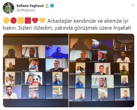 Terim'in ardından Galatasaray'ın Cezayirli oyuncusu Sofiane Feghouli de görüşmenin ekran görüntüsünü paylaşarak "Arkadaşlar kendinize ve ailenize iyi bakın. Sizleri özledim, yakında görüşmek üzere İnşallah" ifadelerini kullandı.