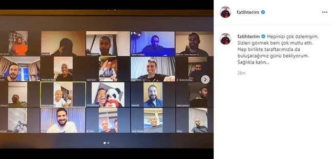 30 Mart Pazartesi günü corona virüsü (Covid-19) tedavisi gördüğü hastaneden taburcu olan ve tedavi sürecine evinden devam eden Galatasaray Teknik Direktörü Fatih Terim sosyal medya hesabından paylaşımda bulundu. Oyuncularıyla telekonferans aracılığıyla yaptığı görüşmenin ekran görüntüsüne yer veren Terim, "Hepinizi çok özlemişim" ifadelerini kullandı.