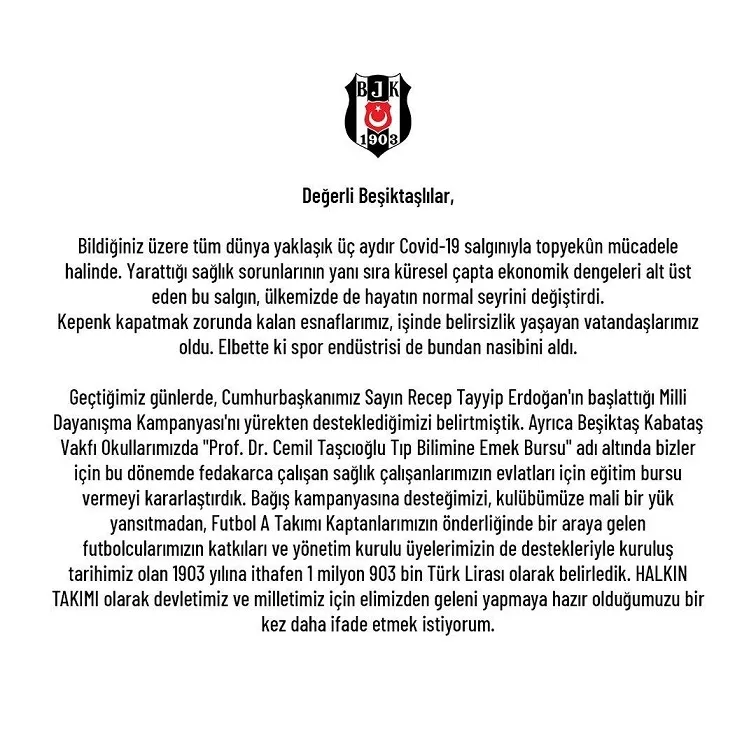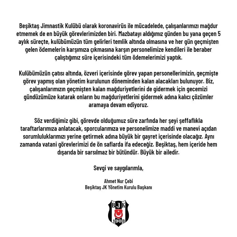 Beşiktaş Jimnastik Kulübü olarak koronavirüs ile mücadelede, çalışanlarımızı mağdur