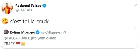 Paris Saint Germain'in yıldız futbolcusu Kylian Mbappe de eski takım arkadaşı Falcao'nun bu paylaşımının altına, "Yetenekli" yorumunu yaptı. Falcao da bu tweeti alıntılayarak, "Asıl yetenekli olan sensin" şeklinde paylaştı.