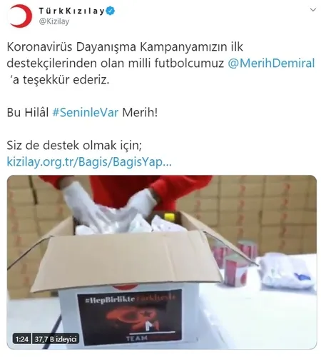 Kızılay bu erzakların kolilere yerleştirildiği videoyu paylaşarak, "Koronavirüs Dayanışma Kampanyamızın ilk destekçilerinden olan milli futbolcumuz Merih Demiral'a teşekkür ederiz. Bu Hilâl #SeninleVar Merih!" ifadelerini kullandı.