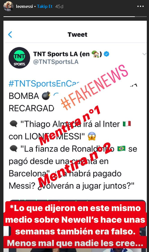 Lionel Messi gönderinin altına da, "Aynı gazetenin birkaç hafta önce Newells'a gideceğim şeklindeki haberi de yanlıştı. Çok şükür ki kimse onlara inanmıyor" yazarak Barcelona'dan ayrılmak gibi bir düşüncesinin olmadığını açıkladı.