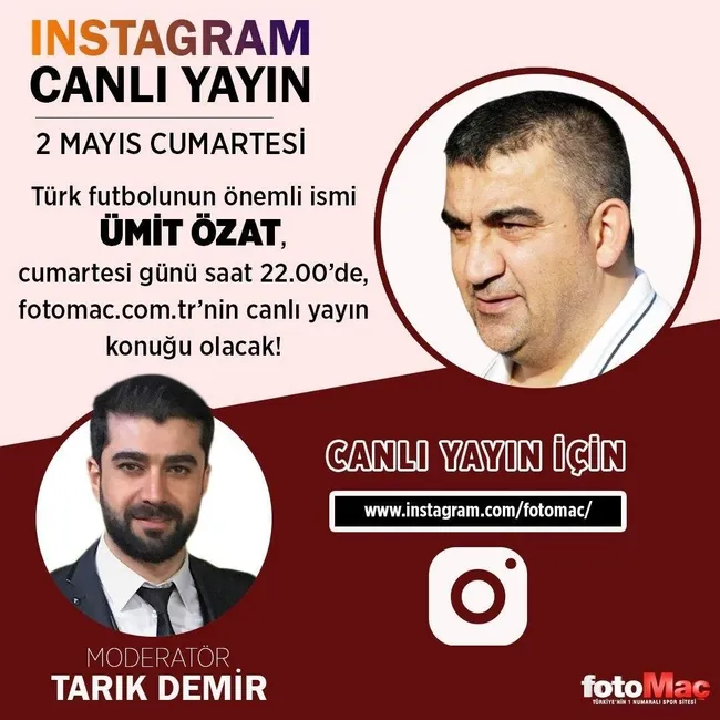Bu kapsamda Türk futbolunun önemli isimlerinden olan ve Bosna Hersek ekiplerinden Celik Zenica'yı çalıştıran teknik direktör Ümit Özat, fotomac.com.tr Instagram canlı yayınına konuk olacak. Özat, Tarık Demir modaretörlüğünde 2 Mayıs saat 22.00'de soruları yanıtlayacak.