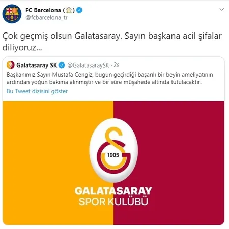 İspanya La Liga ekiplerinden Barcelona'nın Türkçe yayın yapan sosyal medya hesabından beyin ameliyatı geçiren Galatasaray Başkanı Mustafa Cengiz'e geçmiş olsun dilekleri iletildi.