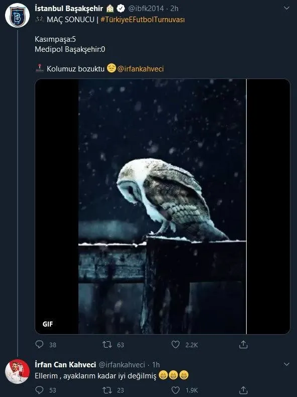 Kasımpaşa - Medipol Başakşehir maçı ise 5-0'lık skorla gülen taraf Anıl Koç ile Kasımpaşa oldu. Medipol Başakşehir, bu mağlubiyeti, sosyal medya hesabından "Kolumuz bozuktu" notuyla paylaştı. Başakşehir'in yıldız ismi İrfan Can Kahveci ise, Medipol Başakşehir'in bu gönderisine, "Ellerim, ayaklarım kadar iyi değilmiş" yorumunda bulundu.