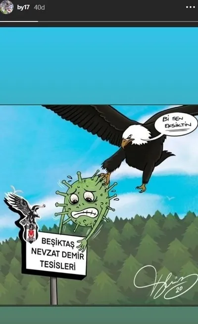Yılmaz'ın paylaşımında bir kartalın, Beşiktaş Nevzat Demir Tesisleri'nin tebalasını tutan bir corona virüsü, oradan uzaklaştırmaya çalıştığı görülüyor.