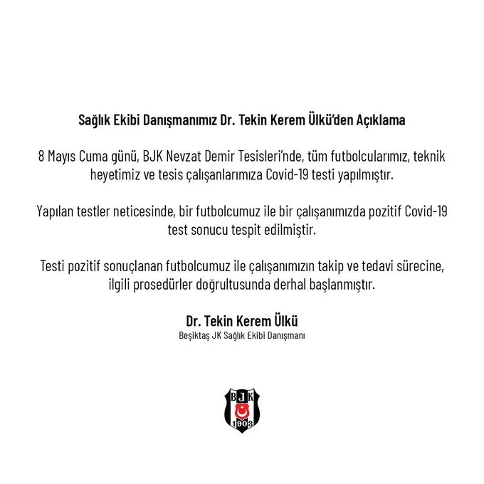 Beşiktaş Kulübü'nden yapılan açıklamada, "8 Mayıs Cuma günü, BJK Nevzat Demir Tesisleri'nde, tüm futbolcularımız, teknik heyetimiz ve tesis çalışanlarımıza COVID-19 testi yapılmıştır. Yapılan testler neticesinde, bir futbolcumuz ile bir çalışanımızda pozitif COVID-19 test sonucu tespit edilmiştir. Testi pozitif sonuçlanan futbolcumuz ile çalışanımızın takip ve tedavi sürecine, ilgili prosedürler doğrultusunda derhal başlanmıştır" ifadeleri yer aldı.