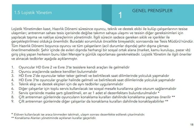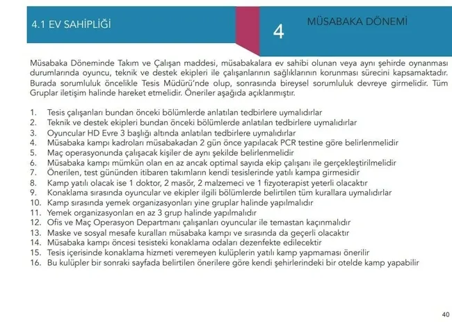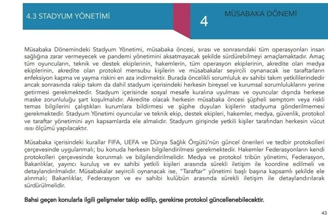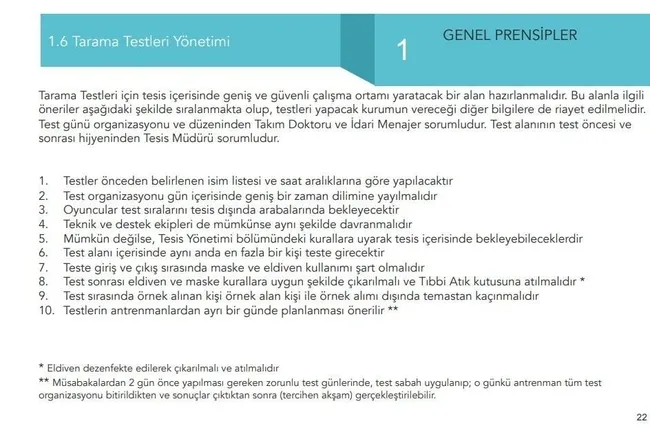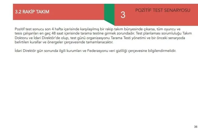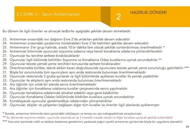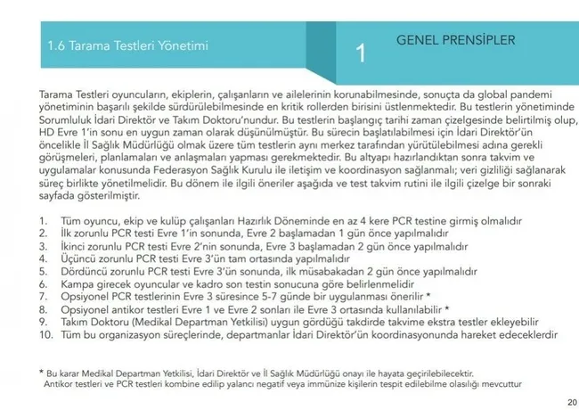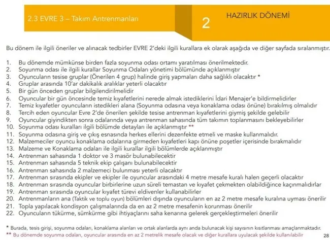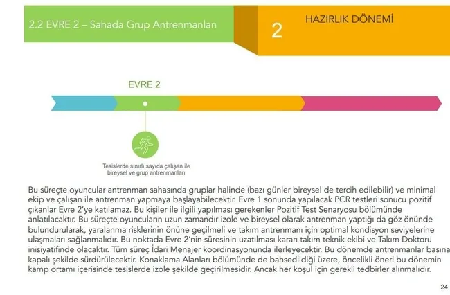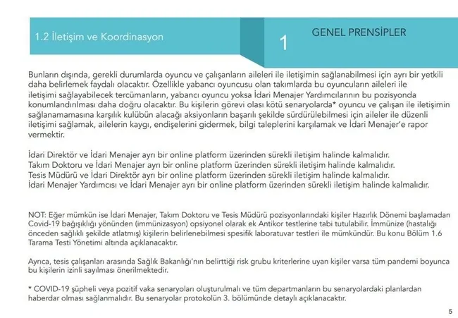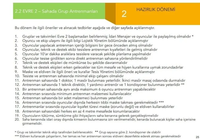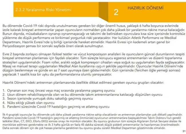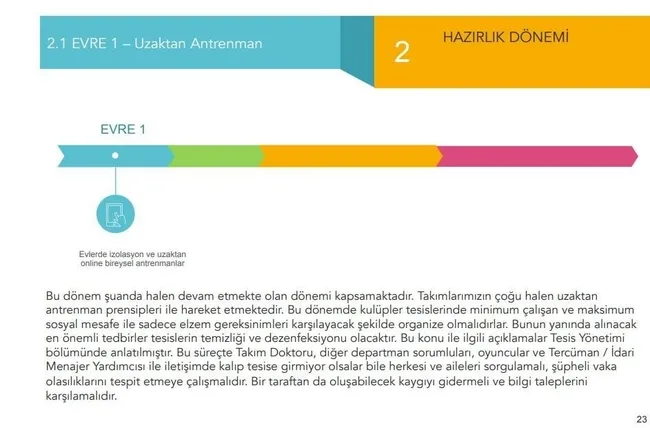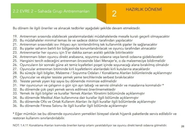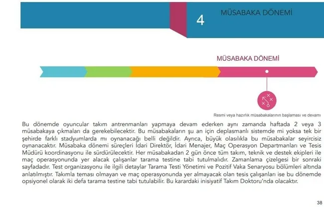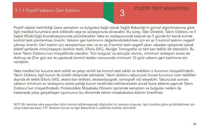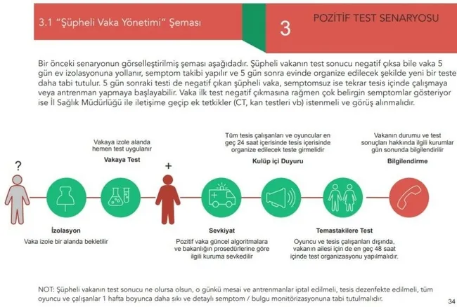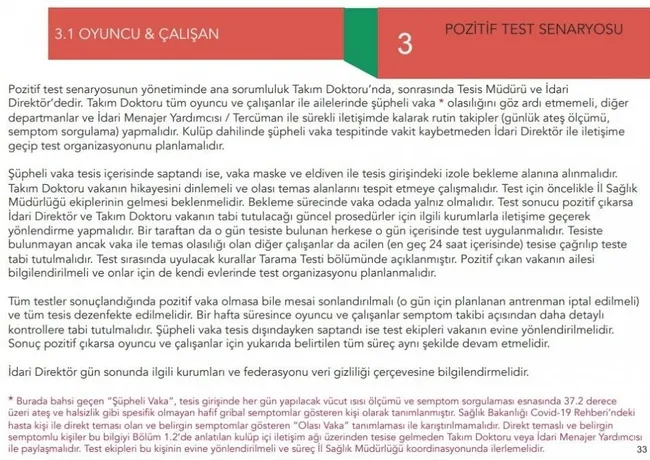 Ayrıca açıklanan belgede, şüpheli vakanın yönetimi, pozitif vakaların geri katılımı, test sonuçlarının değerlendirilmesi, pozitif vaka senaryosu gibi önemli konuların yanı sıra, uzaktan antrenmanlar ile antrenman sahasındaki grup halindeki çalışmalara değinildiği görülüyor.