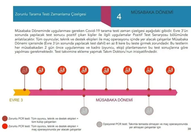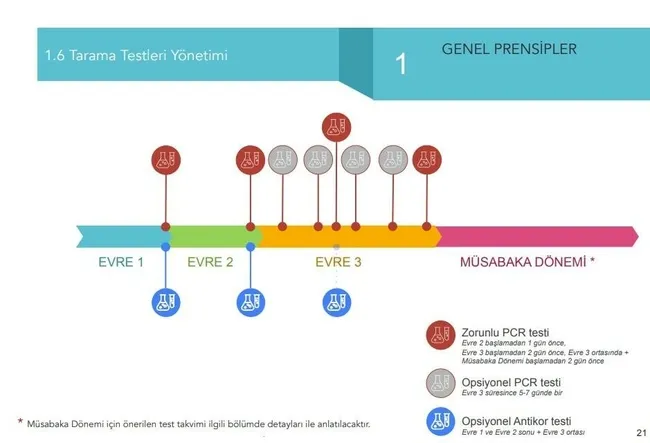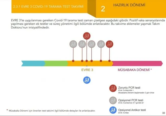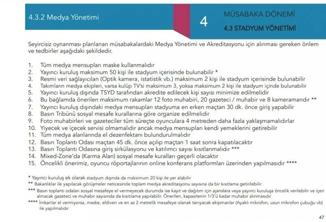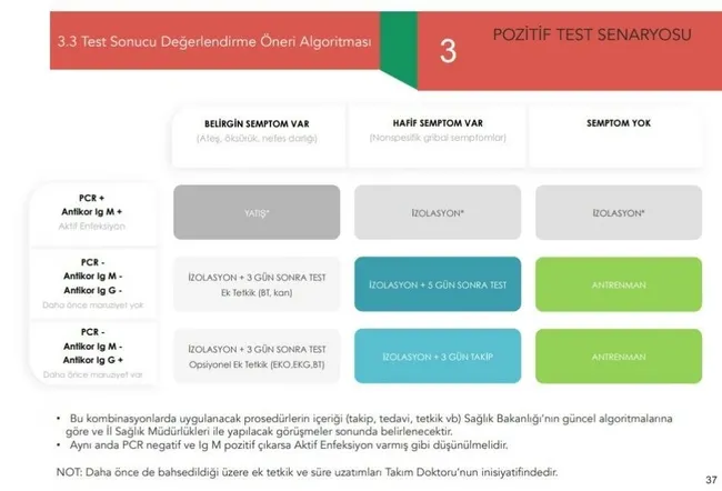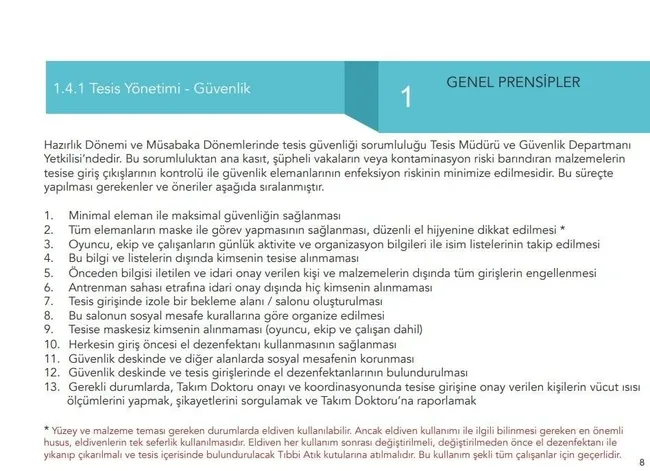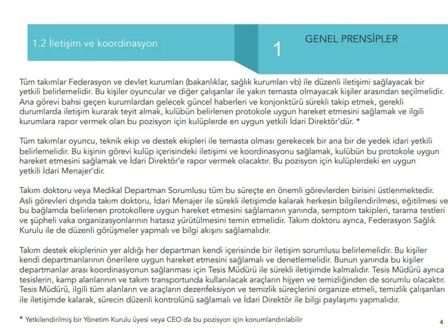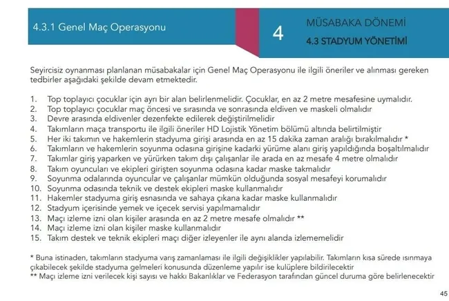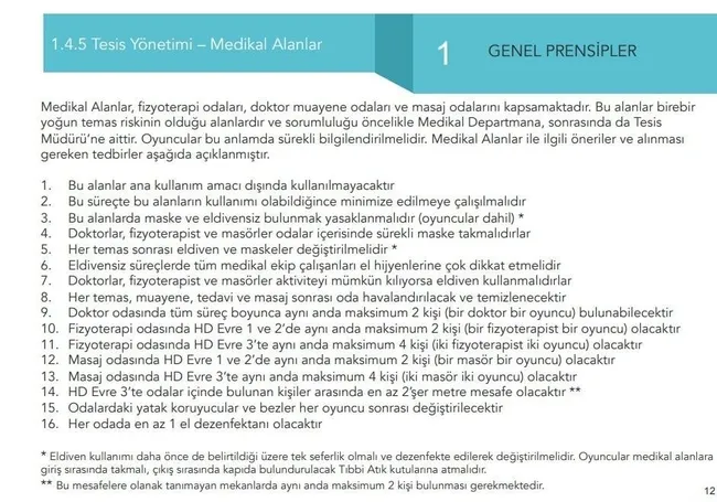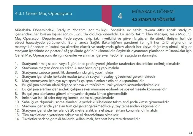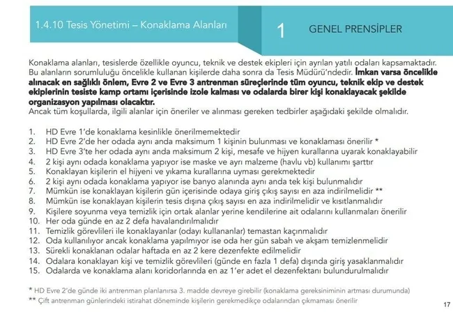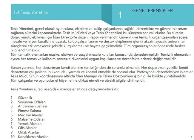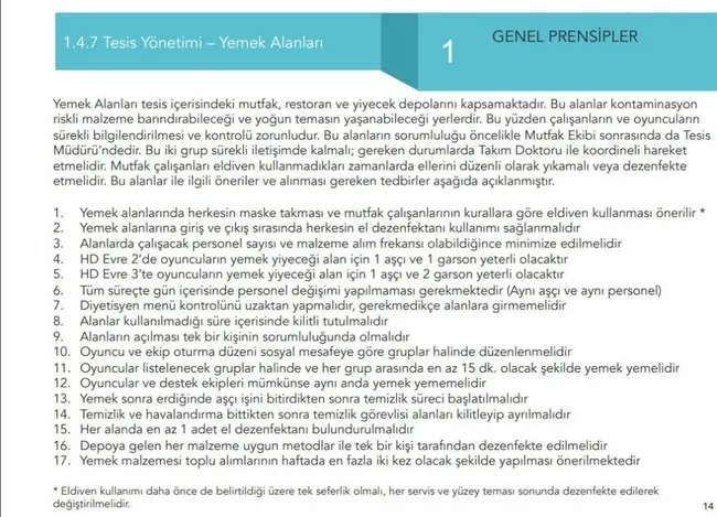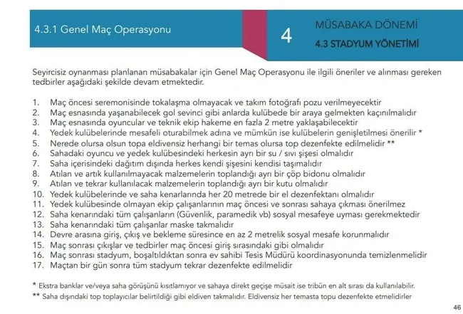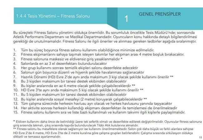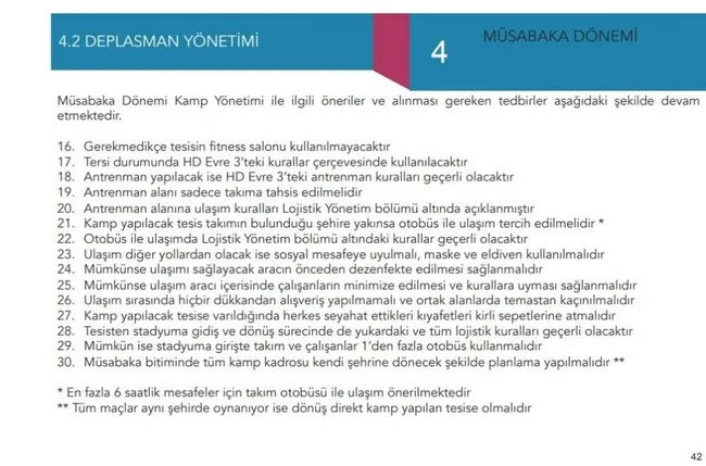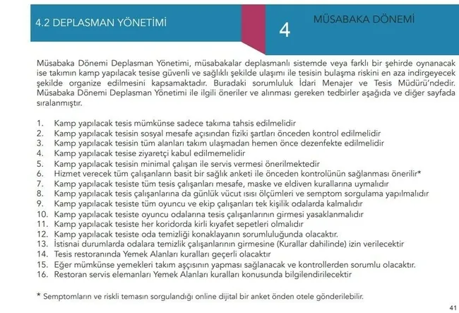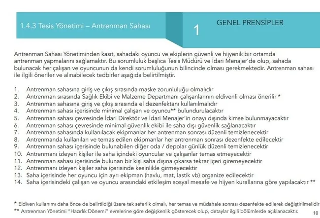 Ayrıca açıklanan belgede, şüpheli vakanın yönetimi, pozitif vakaların geri katılımı, test sonuçlarının değerlendirilmesi, pozitif vaka senaryosu gibi önemli konuların yanı sıra, uzaktan antrenmanlar ile antrenman sahasındaki grup halindeki çalışmalara değinildiği görülüyor.