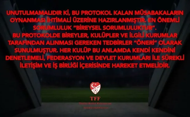 "TFF Sağlık Kurulu, bazı kulüplerimizin liglerle ilgili nihai karar açıklanmadan antrenmanlara başlamış olmaları ve Pandemi sürecinin devam ediyor olmasını da göz önüne alarak 01/05/2020 tarihinde bir dizi önlemin de içinde bulunduğu futbola dönüş öneri protokolünün ilk kısmını açıklamıştır.