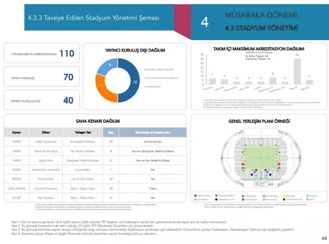 İnternet sitesinde ek belge olarak açıklanan protokol, iletişim, koordinasyon, tesis yönetimi, güvenlik, antrenman sahaları, soyunma odaları, antrenman aletleri, malzeme odaları, yemek ve ortak alanlar, konaklama, lojistik ve testlerin yönetimi gibi ayrıntılı bir dizi konuyu içeriyor.