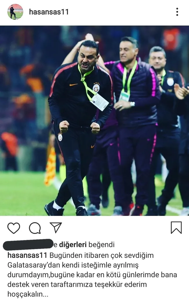 Hasan Şaş'ın istifa açıklaması şöyle: "Bugünden itibaren çok sevdiğim Galatasaray'dan kendi isteğimle ayrılmış durumdayım, bugüne kadar en kötü günlerimde bana destek veren taraftarımıza teşekkür ederim hoşça kalın..."