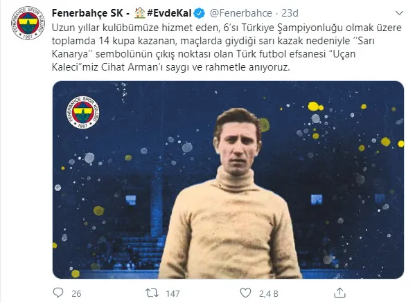 Fenerbahçe Kulübü, eski futbolcusu Cihat Arman için anma mesajı yayımladı.