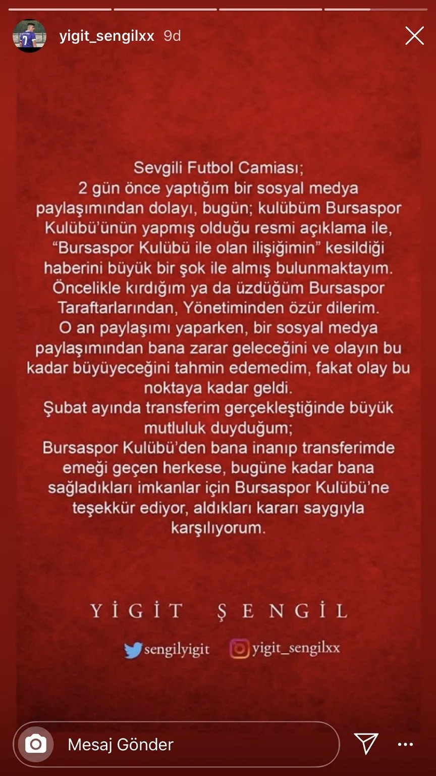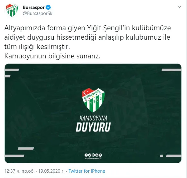 Yeşil-beyazlıların altyapısında forma giyen 16 yaşındaki futbolcu Yiğit Şengil, Beşiktaş'la ilgili bir paylaşım yapması üzerine Bursaspor'dan gönderildi. Yaptığı paylaşımda Beşiktaş logosunun olduğu bir fotoğrafın üzerine, "Var bir hayalimiz" diyerek siyah-beyazlı takımda oynama isteğini belirten genç oyuncunun, dün gece itibariyle Bursaspor kariyeri sona erdi.