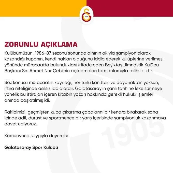 Sarı-kırmızılı kulüpten yapılan açıklamada, "Kulübümüzün, 1986-1987 sezonu sonunda alnının akıyla şampiyon olarak kazandığı kupanın, kendi hakları olduğunu iddia ederek kulüplerine verilmesi yönünde müracaatta bulunduklarını ifade eden Beşiktaş Jimnastik Kulübü Başkanı Sayın Ahmet Nur Çebi'nin açıklamaları tam anlamıyla talihsizliktir." ifadeleri yer aldı.
