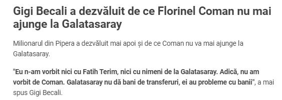 Gigi Becali, konu ile ilgili yaptığı açıklamada, "Fatih Terim ya da Galatasaray'dan biriyle irtibatım olmadı. Coman ile de konuşmadım ancak bildiğim bir şey var, Galatasaray para vermiyor. Onların parayla ilgili sorunları var."