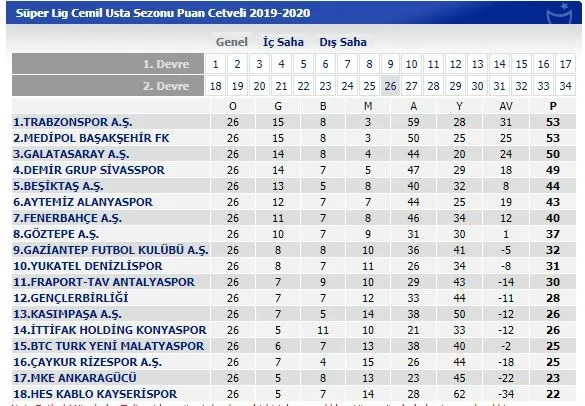 Süper Lig Cemil Usta Sezonu'nun 27. haftası uzun bir aranın ardından yeniden başlıyor. 12 Haziran Cuma akşamı saat 21:00'de oynanacak Göztepe - Trabzonspor ve Fenerbahçe - Kayserispor maçları ile hasret sona eriyor. Futbolseverler büyük bir ilgiyle maçların başlamasını beklerken, 'Süper Lig puan durumu' konusu da en çok merak edilen başlıklar arasında yer alıyor.