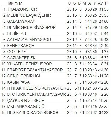 Ligde 53'er puana sahip Trabzonspor ile Medipol Başakşehir bir ve ikinci sırada yer alırken, Galatasaray 50 puanla üçüncü, Demir Grup Sivasspor ise 49 puanla dördüncü sırada bulunuyor.