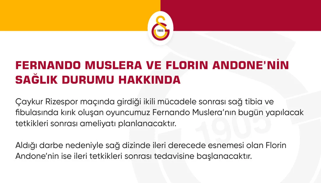 Bu kararın sonrasında Uruguaylı kaleci kaval kemiğinde kırık şüphesiyle hastaneye götürüldü. TRT Spor'da yer alan bilgiye göre Çaykur Rizespor maçında sakatlanan Galatasaray kalecisi Fernando Muslera'nın, sağ ayak tibia ve fibula kemiklerinde kırık tespit edildi. Muslera'nın intrameduller çivi takılarak sağlığına kavuşturulacağı öğrenildi. Yıldız kalecinin sahalardan en az 6 ay uzak kalacağı tahmin ediliyor.
