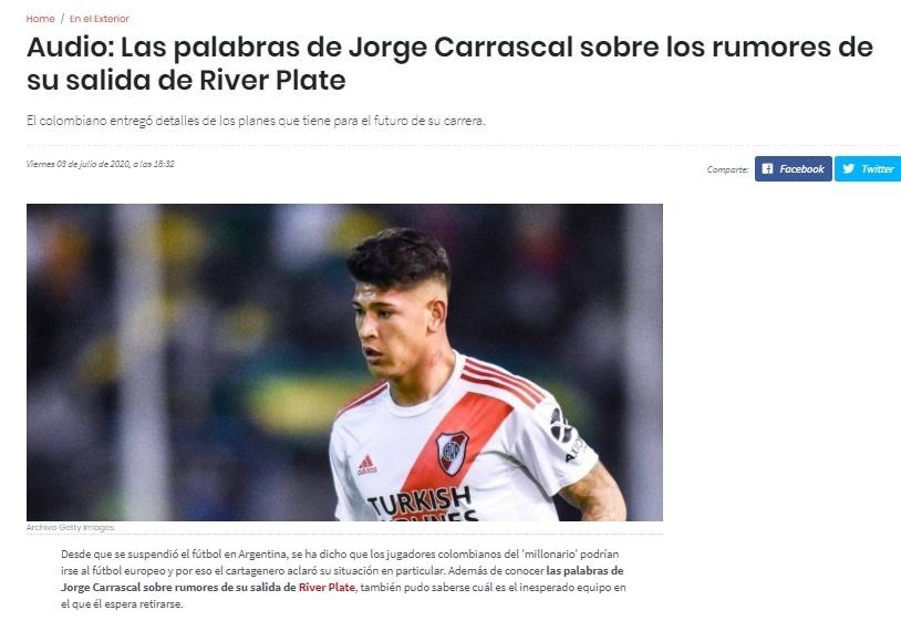 Arjantin Ligi ekiplerinden River Plate forması giyen Jorge Carrascal, Beşiktaş da dahil birçok Avrupa ekibinin transfer gündemindeydi. 22 yaşındaki Kolombiyalı futbolcu Radio Caracol'a yaptığı ve Fotomaç'ın derlediği açıklamada, geleceğine dair dikkat çeken ifadeler kullandı.