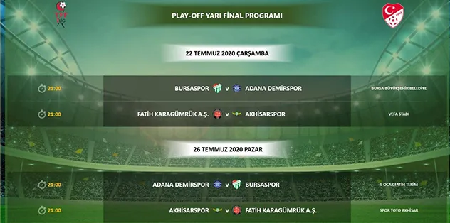 TFF. 1 Lig'de play – off'a kalan takımlar belli oldu. Bugün oynanan altı karşılaşma ile birlikte Hatayspor ve Erzurum BB, Süper Lig'e direk yükselen iki takım olmaya hak kazandı. Play – off'a kalan takımlar ise Adana Demirspor, Akhisarspor, Karagümrük ve Bursaspor oldu. Bu 4 takımın aralarında oynayacakları karşılaşmalardan sonra Süper Lig'e yükselecek üçüncü takım da belli olacak.