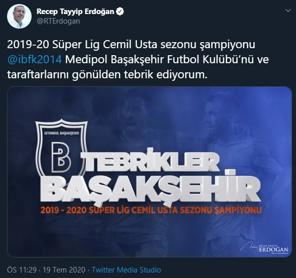 Başkan Recep Tayyip Erdoğan sosyal medya hesabı üzerinden Medipol Başakşehir'in şampiyonluğunu kutladı. Başkan Erdoğan, "2019-20 Süper Lig Cemil Usta sezonu şampiyonu @ibfk2014 Medipol Başakşehir Futbol Kulübü'nü ve taraftarlarını gönülden tebrik ediyorum. Şampiyon Medipol Başakşehir ile birlikte zorlu geçen sezonda mücadeleleriyle futbolun rekabetçi fakat aynı zamanda birleştirici ruhunu yansıtan tüm takımlarımıza teşekkür ediyor, her birinin başarılarının devamını diliyorum." ifadelerini kullandı.
