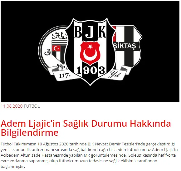 Futbol Takımımızın 10 Ağustos 2020 tarihinde BJK Nevzat Demir Tesisleri'nde gerçekleştirdiği yeni sezonun ilk antrenmanı sırasında sağ baldırında ağrı hisseden futbolcumuz Adem Ljajic'in Acıbadem Altunizade Hastanesi'nde yapılan MR görüntülemesinde, 'Soleus' kasında hafif-orta evre zorlanma saptanmış olup futbolcumuzun tedavisine sağlık ekibimiz tarafından başlanmıştır.