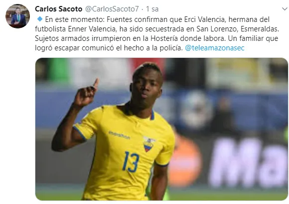 Ekvadorlu gazeteci Carlos Sacoto'nun verdiği bilgiye göre, Enner Valencia'nın kız kardeşi Erci Valencia silahlı bir grup tarafından kaçırıldı. Sacoto, silahlı grubun Erci Valencia'nın çalıştığı oteli bastığını ve Ekvadorlu yıldızın kardeşini kaçırdığını aktardı.