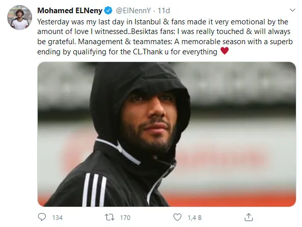 Geçtiğimiz sezonu Beşiktaş'ta kiralık olarak geçiren Elneny, siyah beyazlı kulübe veda etti. Mısırlı futbolcu sosyal medyadan yaptığı paylaşımda "Dün İstanbul'da son günümdü ve taraftarlar bana gösterdikleri sevgiyle bunu çok duygusal hale getirdi. Beşiktaş taraftarları, gerçekten etkilendim ve her zaman minnettar olacağım." ifadelerini kullandı.